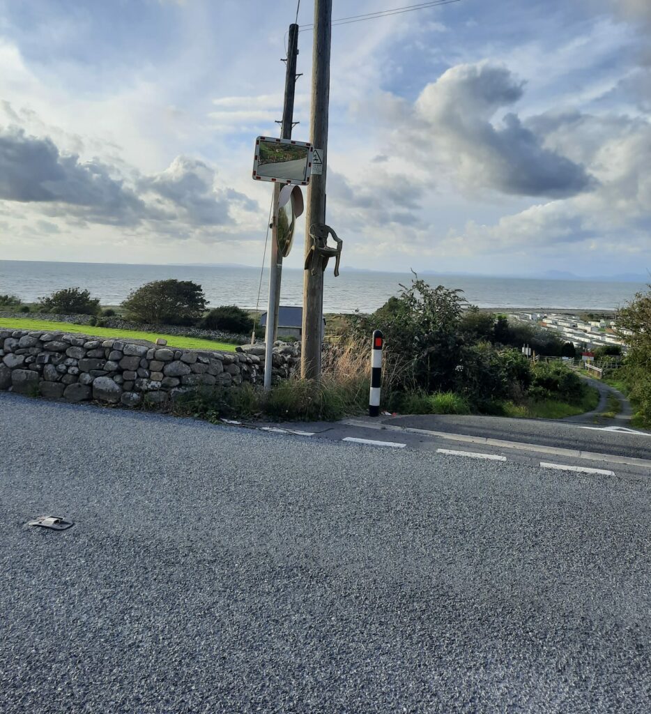 • Follow the coast for 1.9 miles until you reach a small crossroads. On the left you will see a post with mirrors and a small chair attached to it.